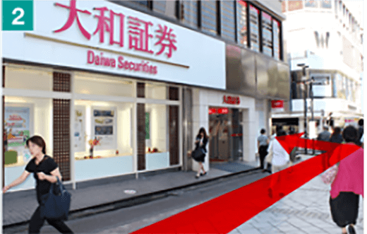 ジョイナスを出ると正面右手にスーツカンパニー、左手に大和証券がありますのでその間の道を直進します。