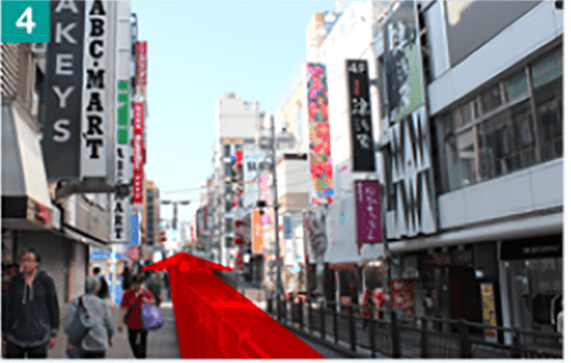 橋を渡り直進すると左手にドラッグストア、右手にドン・キホーテがありますのでそのまま直進してください。